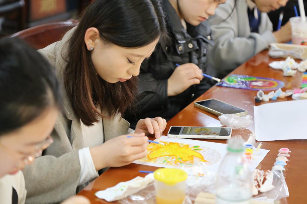 随后的玻璃画 DIY 环节,将现场气氛推向高潮。主持人曾祥上台,细致讲解玻璃画制作全流程,从工具正确使用、颜料精准调配到图案创意绘制技巧,条理清晰、干货满满,帮助同学们快速掌握创作要领。讲解结束后,同学们迅速投入创作,现场灵感迸发、创意十足:有人绘出娇艳绽放的玫瑰,象征女性坚韧不屈又美好温柔的特质;有人勾勒灵动可爱的小动物,展现女性活泼俏皮的一面;还有人设计独特抽象图案,大胆表达内心的想法与态度。创作过程中,同学们相互交流经验、主动伸出援手,分享创意心得的同时共同攻克制作难题,现场氛围热烈又温馨。