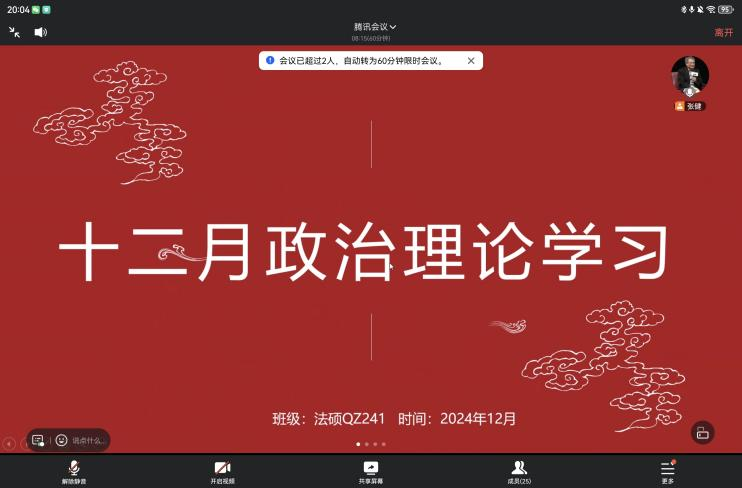 (通讯员 杨绚清)为深入学习贯彻习近平新时代中国特色社会主义思想,切实增强研究生群体的“四个意识”、坚定“四个自信”、做到“两个维护”,持续提升球王会网站研究生的政治理论素养与思想觉悟,深刻领会党的二十大精神的核心要义与实践要求,12月25日晚20:00,球王会网站研究生各班级以线上形式成功举办十二月政治理论学习班会。全体班级成员积极响应、踊跃参与,共同完成了一场内容充实、意义深远的理论学习之旅。