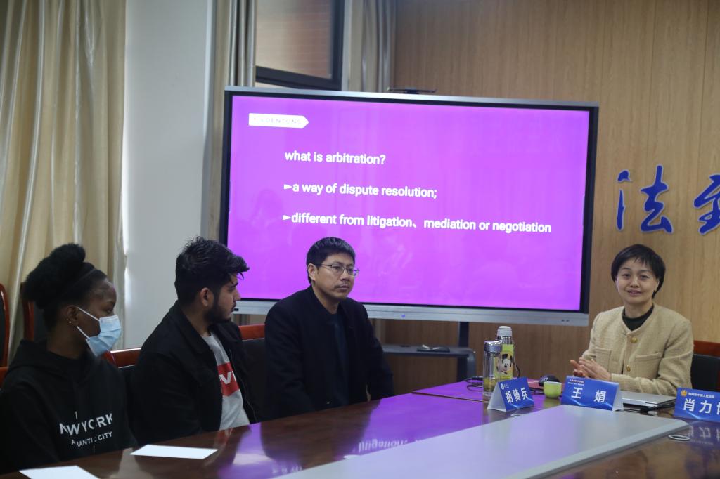 会议伊始,由胡骑兵用英文对座谈目的及参会人员进行介绍。随后,王娟律师由“作为留学生,你可以做什么”这一问题引入,展开对留学生就业方向的讲解。她指出:“外国留学生有最常见的两种就业选择——在所在国家政府机构任职或在与中国有关的公司及学校任教。而第三种不错的选择即为仲裁员”。随后,王娟从“仲裁”角度切入,与留学生简单讨论后给出相关解释——它是解决争议的方式,不同于诉讼、调解或谈判,并详细讲解仲裁与诉讼、调解及谈判的区别。接着,展开对“ICC”、“LCIA”、“SIAC”、“CIETAC”等相关仲裁机构的介绍,提出“仲裁员需要有什么资格?如何成为仲裁员”这一问题并给予指导,为留学生就业提供方法指南。在座谈会全程,主持人和与会嘉宾以及各位留学生均全英文踊跃发言讨论,气氛热烈,反响强烈。会议尾声,参会人员合影留念。