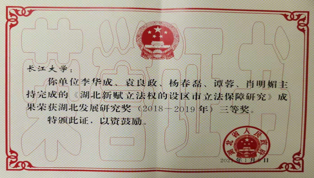 学校是湖北地方立法与研究的重要推动者。地方立法研究团队先后主持承担省人大立法理论相关研究课题12项;执笔了2016年设区市获地方立法权以来荆州7部地方性法规的起草工作;递交的《湖北新赋立法权设区市立法运行保障》的研究报告获省领导签批,系列成果获湖北发展研究奖。