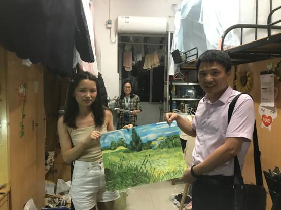 离别之际,领导老师们还叮嘱毕业生要尽早收拾好行囊,在离校期间注意人身及财产安全,将来要与母校保持联系,常回来看看,母校永远是最温情的港湾。毕业生们对于领导老师深入寝室慰问表示衷心感谢,还有毕业生将自己的画作赠与学院,真诚地表达了对学院、老师和同学的留恋,表明将始终情系学院发展,努力为学院建设增光增彩,不辜负领导老师们的期望。