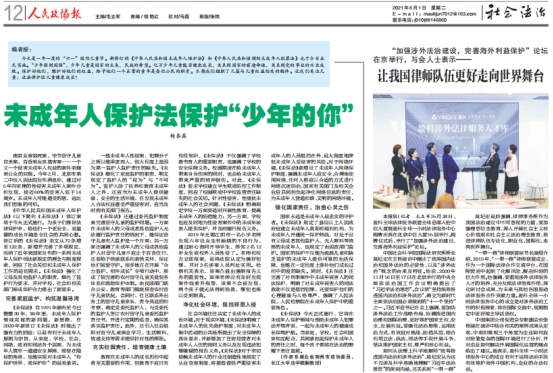 6月1日为国际儿童节也是新修订的《中华人民共和国未成年人保护法》生效之时,《人民政协报》刊发球王会网站杨春磊博士的普法时评《未成年人保护法保护“少年的你”》。